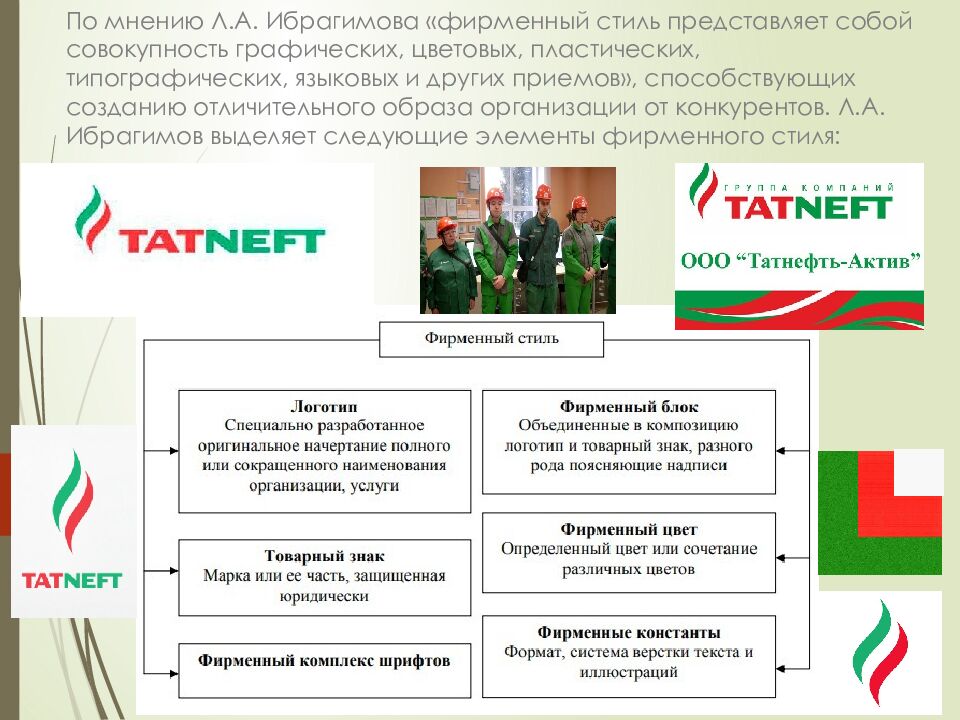 По мнению Л.А. Ибрагимова «фирменный стиль представляет собой совокупность графических, цветовых, пластических, типографических, языковых и других приемов», способствующих созданию отличительного образа организации от конкурентов. Л.А. Ибрагимов выделяет следующие элементы фирменного стиля: