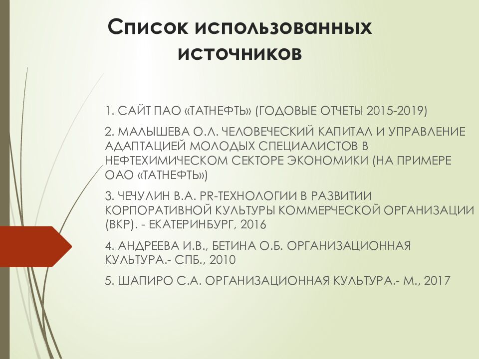 1. Сайт пао « татнефть » (годовые отчеты 201 5 -2019) 2. Малышева о.л. ЧЕЛОВЕЧЕСКИЙ КАПИТАЛ И УПРАВЛЕНИЕ АДАПТАЦИЕЙ МОЛОДЫХ СПЕЦИАЛИСТОВ В НЕФТЕХИМИЧЕСКОМ СЕКТОРЕ ЭКОНОМИКИ (НА ПРИМЕРЕ ОАО «ТАТНЕФТЬ ») 3. ЧЕЧУЛИН В.А. PR-ТЕХНОЛОГИИ В РАЗВИТИИ КОРПОРАТИВНОЙ КУЛЬТУРЫ КОММЕРЧЕСКОЙ ОРГАНИЗАЦИИ (ВКР). - ЕКАТЕРИНБУРГ, 2016 4. АНДРЕЕВА И.В., БЕТИНА О.Б. ОРГАНИЗАЦИОННАЯ КУЛЬТУРА.- СПБ., 2010 5. ШАПИРО С.А. ОРГАНИЗАЦИОННАЯ КУЛЬТУРА.- М., 2017