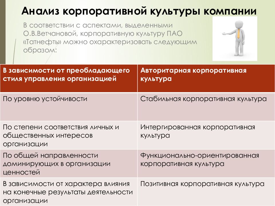 В зависимости от преобладающего стиля управления организацией Авторитарная корпоративная культура По уровню устойчивости Стабильная корпоративная культура По степени соответствия личных и общественных интересов организации Интергированная корпоративная культура По общей направленности доминирующих в организации ценностей Функционально-ориентированная корпоративная культура В зависимости от характера влияния на конечные результаты деятельности организации Позитивная корпоративная культура В соответствии с аспектами, выделенными О.В.Ветчановой, корпоративную культуру ПАО « Татнефть » можно охарактеризовать следующим образом: Анализ корпоративной культуры компании
