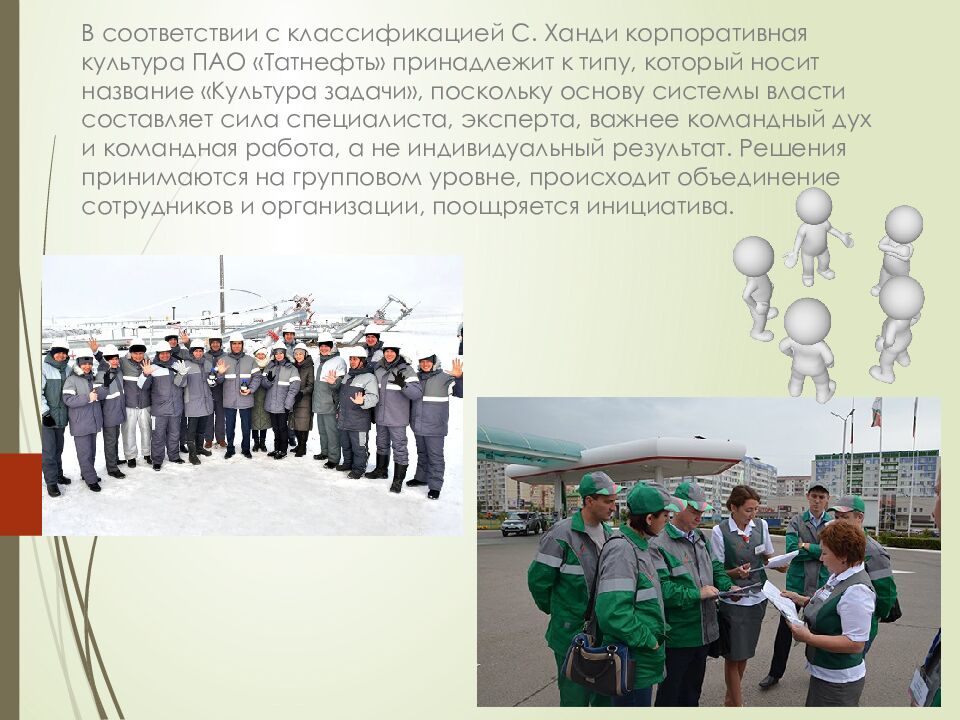 В соответствии с классификацией С. Ханди корпоративная культура ПАО « Татнефть » принадлежит к типу, который носит название «Культура задачи», поскольку основу системы власти составляет сила специалиста, эксперта, важнее командный дух и командная работа, а не индивидуальный результат. Решения принимаются на групповом уровне, происходит объединение сотрудников и организации, поощряется инициатива.