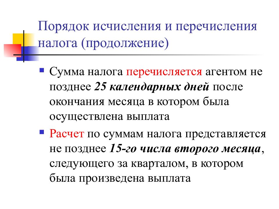 Слайд 9: Порядок исчисления и перечисления налога (продолжение)