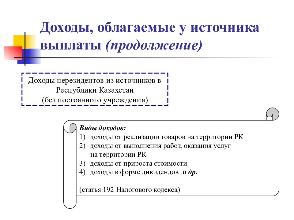 Доходы нерезидентов из источников в Республики Казахстан (без постоянного учреждения) Виды доходов: доходы от реализации товаров на территории РК доходы от выполнения работ, оказания услуг на территории РК доходы от прироста стоимости доходы в форме дивидендов и др. (статья 192 Налогового кодекса)