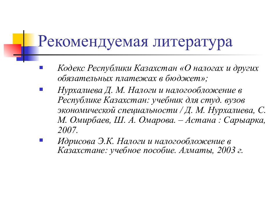 Кодекс Республики Казахстан «О налогах и других обязательных платежах в бюджет»; Нурхалиева Д. М. Налоги и налогообложение в Республике Казахстан: учебник для студ. вузов экономической специальности / Д. М. Нурхалиева, С. М. Омирбаев, Ш. А. Омарова. – Астана : Сарыарка, 2007. Идрисова Э.К. Налоги и налогообложение в Казахстане: учебное пособие. Алматы, 2003 г.