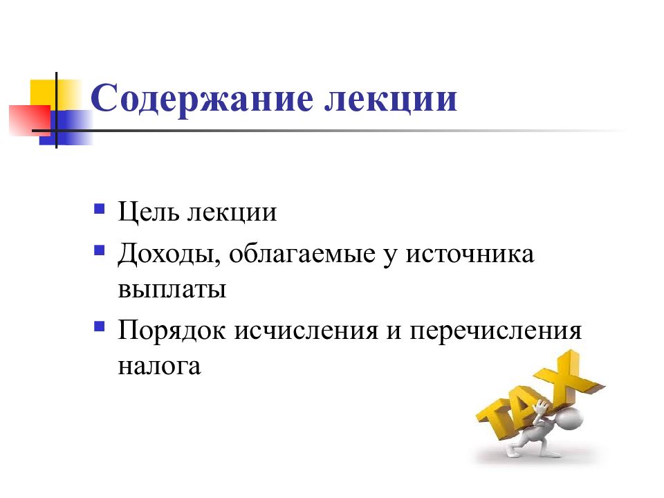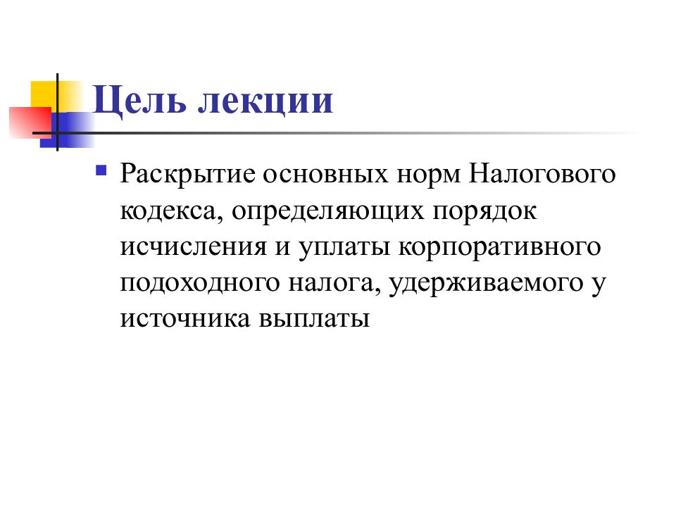 Цель лекции Доходы, облагаемые у источника выплаты Порядок исчисления и перечисления налога