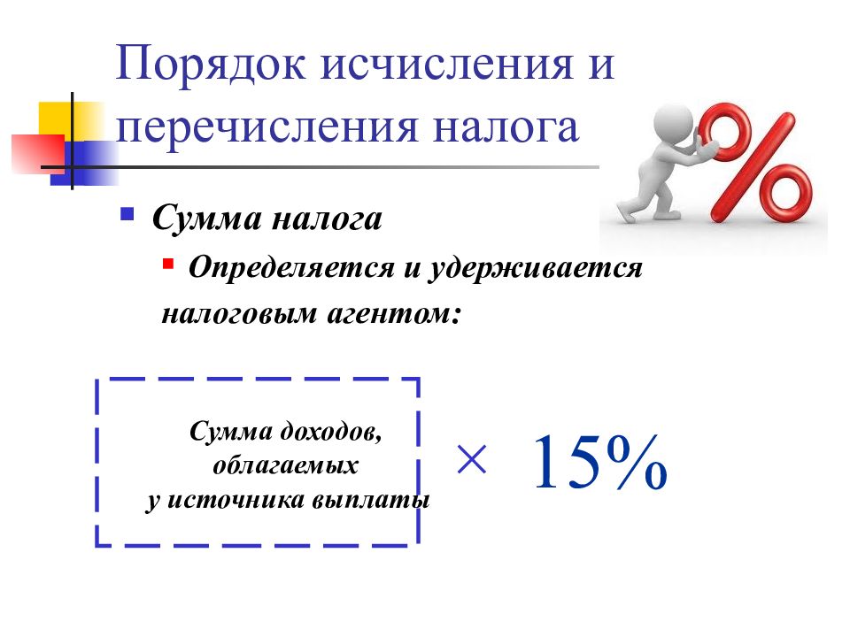Сумма налога Определяется и удерживается налоговым агентом: Сумма доходов, облагаемых у источника выплаты 15%