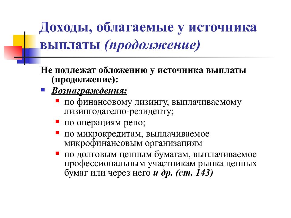 Не подлежат обложению у источника выплаты (продолжение): Вознаграждения: по финансовому лизингу, выплачиваемому лизингодателю-резиденту; по операциям репо; по микрокредитам, выплачиваемое микрофинансовым организациям по долговым ценным бумагам, выплачиваемое профессиональным участникам рынка ценных бумаг или через него и др. (ст. 143) Доходы, облагаемые у источника выплаты (продолжение)