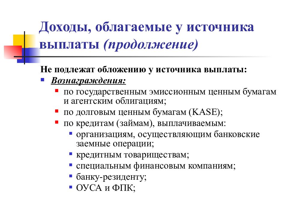 Не подлежат обложению у источника выплаты: Вознаграждения: по государственным эмиссионным ценным бумагам и агентским облигациям; по долговым ценным бумагам ( KASE ); по кредитам (займам), выплачиваемым: организациям, осуществляющим банковские заемные операции; кредитным товариществам; специальным финансовым компаниям; банку-резиденту; ОУСА и ФПК; Доходы, облагаемые у источника выплаты (продолжение)