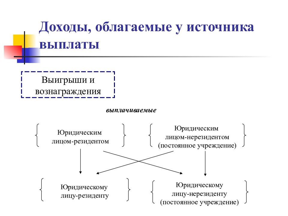 Выигрыши и вознаграждения выплачиваемые Юридическим лицом-резидентом Юридическим лицом-нерезидентом (постоянное учреждение) Юридическому лицу-резиденту Юридическому лицу-нерезиденту (постоянное учреждение)