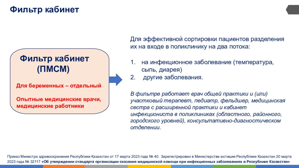Для эффективной сортировки пациентов разделения их на входе в поликлинику на два потока: на инфекционное заболевание (температура, сыпь, диарея) другие заболевания. В фильтре работает врач общей практики и (или) участковый терапевт, педиатр, фельдшер, медицинская сестра с расширенной практики и кабинет инфекциониста в поликлиниках (областного, районного, городского уровней), консультативно-диагностическом отделении. Фильтр кабинет (ПМСМ) Для беременных – отдельный Опытные медицинские врачи, медицинские работники Приказ Министра здравоохранения Республики Казахстан от 17 марта 2023 года № 40. Зарегистрирован в Министерстве юстиции Республики Казахстан 20 марта 2023 года № 32117 «Об утверждении стандарта организации оказания медицинской помощи при инфекционных заболеваниях в Республике Казахстан» Фильтр кабинет