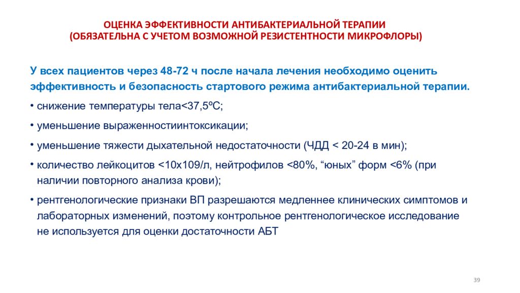 У всех пациентов через 48-72 ч после начала лечения необходимо оценить эффективность и безопасность стартового режима антибактериальной терапии. снижение температуры тела<37,5ºС; уменьшение выраженностиинтоксикации ; уменьшение тяжести дыхательной недостаточности (ЧДД < 20-24 в мин); количество лейкоцитов <10х109/л, нейтрофилов <80%, “юных” форм <6% (при наличии повторного анализа крови); рентгенологические признаки ВП разрешаются медленнее клинических симптомов и лабораторных изменений, поэтому контрольное рентгенологическое исследование не используется для оценки достаточности АБТ 39