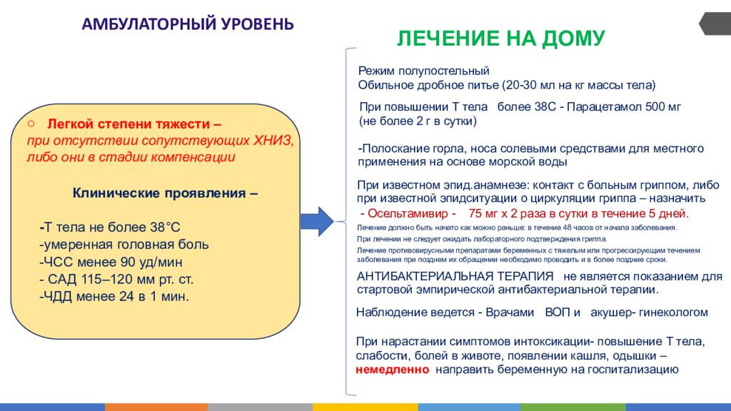 Режим полупостельный Обильное дробное питье (20-30 мл на кг массы тела) - Полоскание горла, носа солевыми средствами для местного применения на основе морской воды При известном эпид.анамнезе : контакт с больным гриппом, либо при известной эпидситуации о циркуляции гриппа – назначить - Осельтамивир - 75 мг х 2 раза в сутки в течение 5 дней. Лечение должно быть начато как можно раньше: в течение 48 часов от начала заболевания. При лечении не следует ожидать лабораторного подтверждения гриппа. Лечение противовирусными препаратами беременных с тяжелым или прогрессирующим течением заболевания при позднем их обращении необходимо проводить и в более поздние сроки. Наблюдение ведется - Врачами ВОП и акушер- гинекологом При нарастании симптомов интоксикации- повышение Т тела, слабости, болей в животе, появлении кашля, одышки – немедленно направить беременную на госпитализацию АНТИБАКТЕРИАЛЬНАЯ ТЕРАПИЯ не является показанием для стартовой эмпирической антибактериальной терапии. Клинические проявления – - Т тела не более 38°С -умеренная головная боль -ЧСС менее 90 уд/мин - САД 115–120 мм рт. ст. -ЧДД менее 24 в 1 мин. Легкой степени тяжести – при отсутствии сопутствующих ХНИЗ, либо они в стадии компенсации При повышении Т тела более 38С - Парацетамол 500 мг ( не более 2 г в сутки) ЛЕЧЕНИЕ НА ДОМУ