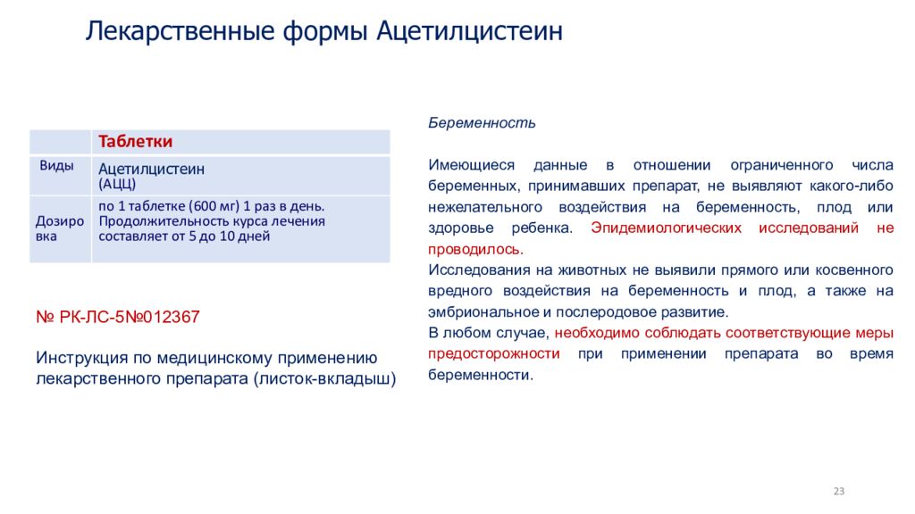 Таблетки Виды Ацетилцистеин (АЦЦ) Дозировка по 1 таблетке (600 мг) 1 раз в день. Продолжительность курса лечения составляет от 5 до 10 дней Лекарственные формы Ацетилцистеин Беременность Имеющиеся данные в отношении ограниченного числа беременных, принимавших препарат, не выявляют какого-либо нежелательного воздействия на беременность, плод или здоровье ребенка. Эпидемиологических исследований не проводилось. Исследования на животных не выявили прямого или косвенного вредного воздействия на беременность и плод, а также на эмбриональное и послеродовое развитие. В любом случае, необходимо соблюдать соответствующие меры предосторожности при применении препарата во время беременности. № РК-ЛС-5№ 012367 Инструкция по медицинскому применению лекарственного препарата (листок-вкладыш) 23