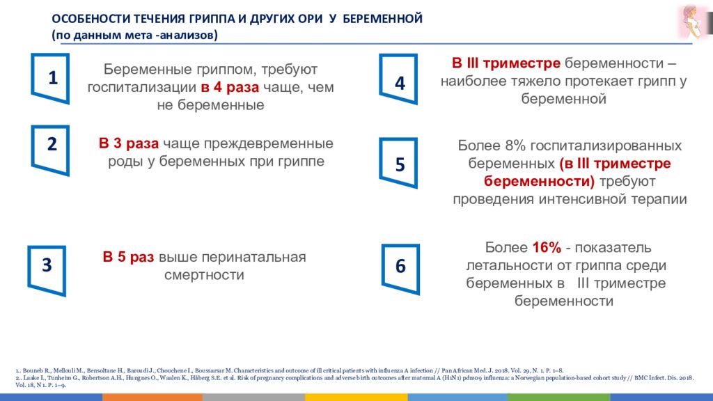 Беременные гриппом, требуют госпитализации в 4 раза чаще, чем не беременные В III триместре беременности – наиболее тяжело протекает грипп у беременной Более 8% госпитализированных беременных (в III триместре беременности) требуют проведения интенсивной терапии В 3 раза чаще преждевременные роды у беременных при гриппе В 5 раз выше перинатальная смертности Б олее 16% - показатель летальности от гриппа среди беременных в III триместре беременности ОСОБЕНОСТИ ТЕЧЕНИЯ ГРИППА И ДРУГИХ ОРИ У БЕРЕМЕННОЙ (по данным мета -анализов) 5 4 2 3 1 6 1.. Bouneb R., Mellouli M., Bensoltane H., Baroudi J., Chouchene I., Boussarsar M. Characteristics and outcome of ill critical patients with influenza A infection // Pan African Med. J. 2018. Vol. 29, N. 1. P. 1–8. 2.. Laake I., Tunheim G., Robertson A.H., Hungnes O., Waalen K., Håberg S.E. et al. Risk of pregnancy complications and adverse birth outcomes after maternal A (H1N1) pdm09 influenza: a Norwegian population-based cohort study // BMC Infect. Dis. 2018. Vol. 18, N 1. P. 1–9. 7