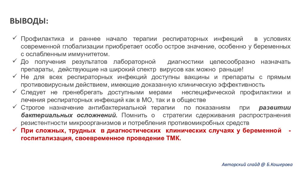 Профилактика и раннее начало терапии респираторных инфекций в условиях современной глобализации приобретает особо острое значение, особенно у беременных с ослабленным иммунитетом. До получения результатов лабораторной диагностики целесообразно назначать препараты, действующие на широкий спектр вирусов как можно раньше ! Не для всех респираторных инфекций доступны вакцины и препараты с прямым противовирусным действием, имеющие доказанную клиническую эффективность Следует не пренебрегать доступными мерами неспецифической профилактики и лечения респираторных инфекций как в МО, так и в обществе Строгое назначение антибактериальной терапии по показаниям при развитии бактериальных осложнений. Помнить о стратегии сдерживания распространения резистентности микроорганизмов и потребления противомикробных средств При сложных, трудных в диагностических клинических случаях у беременной - госпитализация, своевременное проведение ТМК. ВЫВОДЫ: Авторский слайд @ Б.Кошерова