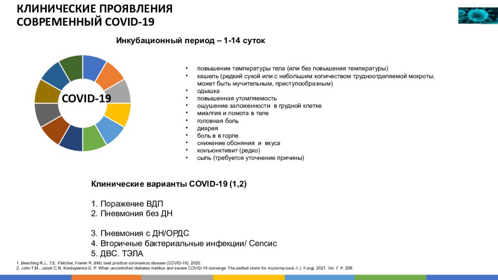повышение температуры тела (или без повышения температуры) кашель (редкий сухой или с небольшим количеством трудноотделяемой мокроты, может быть мучительным, приступообразным) одышка повышенная утомляемость ощушение заложенности в грудной клетке миалгия и ломота в теле головная боль диарея боль в в горле снижение обоняния и вкуса конъюнктивит (редко) сыпь (требуется уточнение причины) Инкубационный период – 1-14 суток Клинические варианты COVID-19 (1,2) Поражение ВДП Пневмония без ДН Пневмония с ДН/ОРДС Вторичные бактериальные инфекции/ Сепсис ДВС. ТЭЛА КЛИНИЧЕСКИЕ ПРОЯВЛЕНИЯ СОВРЕМЕННЫЙ COVID-19 COVID-19 1. Beeching N.J., T.E. Fletcher, Fowler R. BMJ best practice coronavirus disease (COVID-19). 2020. 2. John T.M., Jacob C.N. Kontoyiannis D. P. When uncontrolled diabetes mellitus and severe COVID-19 converge: The perfect storm for mucormycosis // J. Fungi. 2021. Vol. 7. P. 298.