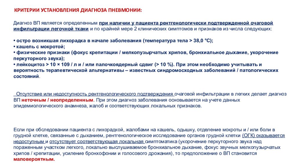 Диагноз ВП является определенным при наличии у пациента рентгенологически подтвержденной очаговой инфильтрации легочной ткани и по крайней мере 2 клинических симптомов и признаков из числа следующих: • остро возникшая лихорадка в начале заболевания (температура тела > 38,0 °С); • кашель с мокротой; • физические признаки (фокус крепитации / мелкопузырчатых хрипов, бронхиальное дыхание, укорочение перкуторного звука); • лейкоцитоз > 10 × 109 / л и / или палочкоядерный сдвиг (> 10 %). При этом необходимо учитывать и вероятность терапевтической альтернативы – известных синдромосходных заболеваний / патологических состояний. Отсутствие или недоступность рентгенологического подтверждения очаговой инфильтрации в легких делает диагноз ВП неточным / неопределенным. При этом диагноз заболевания основывается на учете данных эпидемиологического анамнеза, жалоб и соответствующих локальных признаков. Если при обследовании пациента с лихорадкой, жалобами на кашель, одышку, отделение мокроты и / или боли в грудной клетке, связанные с дыханием, рентгенологическое исследование органов грудной клетки (ОГК) оказывается недоступным и отсутствует соответствующая локальная симптоматика (укорочение перкуторного звука над пораженным участком легкого, локально выслушиваемое бронхиальное дыхание, фокус звучных мелкопузырчатых хрипов / крепитации, усиление бронхофонии и голосового дрожания), то предположение о ВП становится маловероятным. КРИТЕРИИ УСТАНОВЛЕНИЯ ДИАГНОЗА ПНЕВМОНИИ: