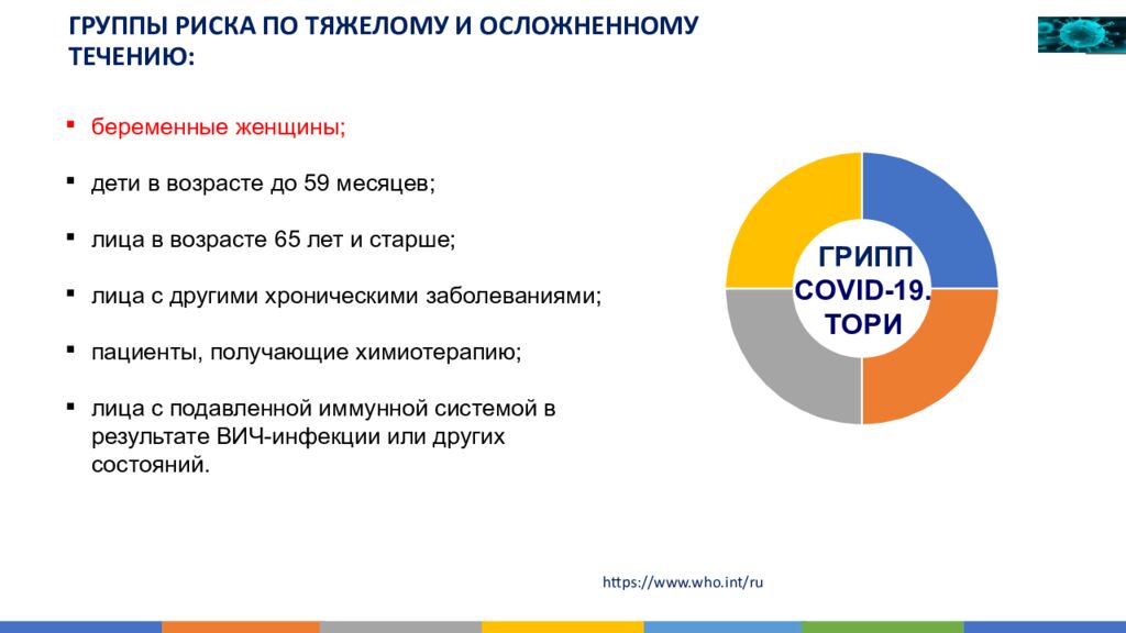5 ГРУППЫ РИСКА ПО ТЯЖЕЛОМУ И ОСЛОЖНЕННОМУ ТЕЧЕНИЮ: беременные женщины ; дети в возрасте до 59 месяцев ; лица в возрасте 65 лет и старше ; лица с другими хроническими заболеваниями ; пациенты, получающие химиотерапию ; лица с подавленной иммунной системой в результате ВИЧ-инфекции или других состояний. ГРИПП COVID-19. ТОРИ https:// www.who.int/ru
