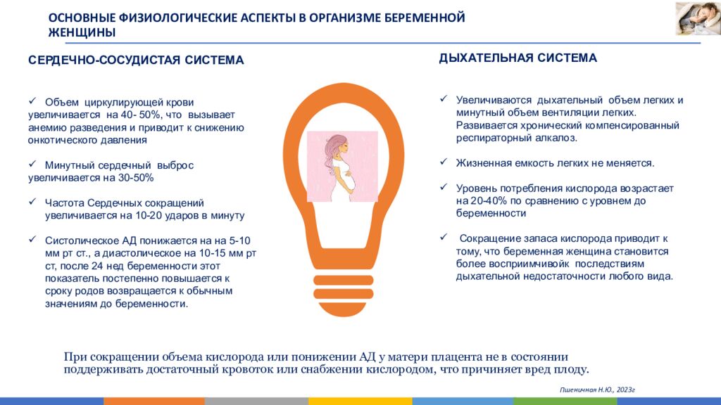СЕРДЕЧНО-СОСУДИСТАЯ СИСТЕМА Объем циркулирующей крови у величивается на 40- 50%, что вызывает анемию разведения и приводит к снижению онкотического давления Минутный сердечный выброс у величивается на 30-50% Частота Сердечных сокращений увеличивается на 10-20 ударов в минуту Систолическое АД понижается на на 5-10 мм рт ст., а диастолическое на 10-15 мм рт ст, после 24 нед беременности этот показатель постепенно повышается к сроку родов возвращается к обычным значениям до беременности. ДЫХАТЕЛЬНАЯ СИСТЕМА Увеличиваются дыхательный объем легких и минутный объем вентиляции легких. Развивается хронический компенсированный респираторный алкалоз. Жизненная емкость легких не меняется. Уровень потребления кислорода возрастает на 20-40% по сравнению с уровнем до беременности Сокращение запаса кислорода приводит к тому, что беременная женщина становится более восприимчивойк последствиям дыхательной недостаточности любого вида. При сокращении объема кислорода или понижении АД у матери плацента не в состоянии поддерживать достаточный кровоток или снабжении кислородом, что причиняет вред плоду. Пшеничная Н.Ю., 2023г 8