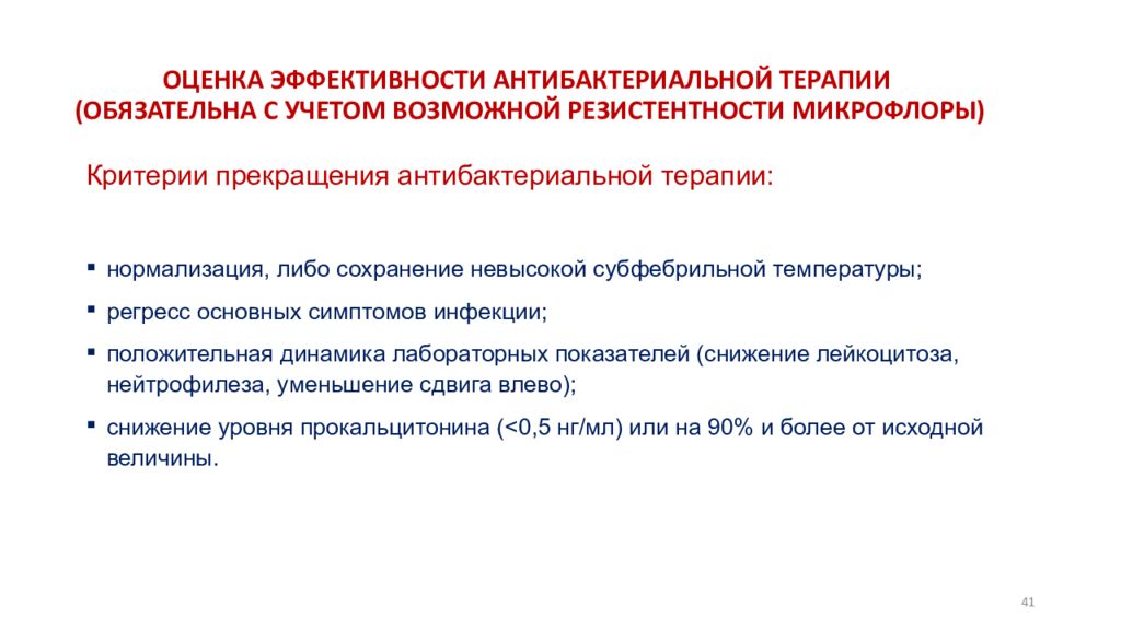Критерии прекращения антибактериальной терапии: нормализация, либо сохранение невысокой субфебрильной температуры; регресс основных симптомов инфекции; положительная динамика лабораторных показателей (снижение лейкоцитоза, нейтрофилеза, уменьшение сдвига влево); снижение уровня прокальцитонина (<0,5 нг /мл) или на 90% и более от исходной величины. 41