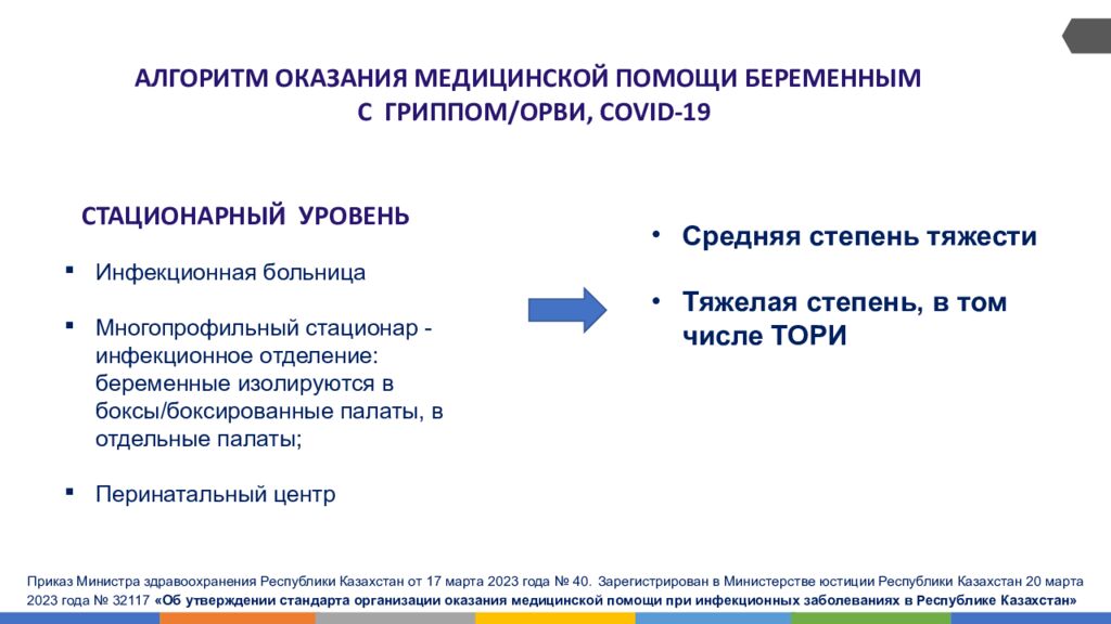 Инфекционная больница Многопрофильный стационар - инфекционное отделение: беременные изолируются в боксы/ боксированные палаты, в отдельные палаты; Перинатальный центр Приказ Министра здравоохранения Республики Казахстан от 17 марта 2023 года № 40. Зарегистрирован в Министерстве юстиции Республики Казахстан 20 марта 2023 года № 32117 «Об утверждении стандарта организации оказания медицинской помощи при инфекционных заболеваниях в Республике Казахстан» СТАЦИОНАРНЫЙ УРОВЕНЬ Средняя степень тяжести Тяжелая степень, в том числе ТОРИ