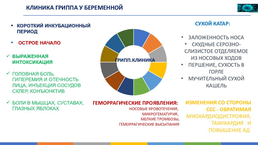 9 КЛИНИКА ГРИППА У БЕРЕМЕННОЙ ВЫРАЖЕННАЯ ИНТОКСИКАЦИЯ ГОЛОВНАЯ БОЛЬ, ГИПЕРЕМИЯ И ОТЕЧНОСТЬ ЛИЦА, ИНЪЕКЦИЯ СОСУДОВ СКЛЕР, КОНЪЮНКТИВ БОЛИ В МЫШЦАХ, СУСТАВАХ, ГЛАЗНЫХ ЯБЛОКАХ ГРИПП.КЛИНИКА ГЕМОРРАГИЧЕСКИЕ ПРОЯВЛЕНИЯ: НОСОВЫЕ КРОВОТЕЧЕНИЯ, МИКРОГЕМАТУРИЯ, МЕЛКИЕ ТРОМБОЗЫ, ГЕМОРРАГИЧЕСКИЕ ВЫСЫПАНИЯ СУХОЙ КАТАР: ЗАЛОЖЕННОСТЬ НОСА СКУДНЫЕ СЕРОЗНО-СЛИЗИСТОЕ ОТДЕЛЯЕМОЕ ИЗ НОСОВЫХ ХОДОВ ПЕРШЕНИЕ, СУХОСТЬ В ГОРЛЕ МУЧИТЕЛЬНЫЙ СУХОЙ КАШЕЛЬ КОРОТКИЙ ИНКУБАЦИОННЫЙ ПЕРИОД ОСТРОЕ НАЧАЛО ИЗМЕНЕНИЯ СО СТОРОНЫ ССС - ОБРАТИМАЯ МИОКАРДИОДИСТРОФИЯ, ТАХИКАРДИЯ И ПОВЫШЕНИЕ АД