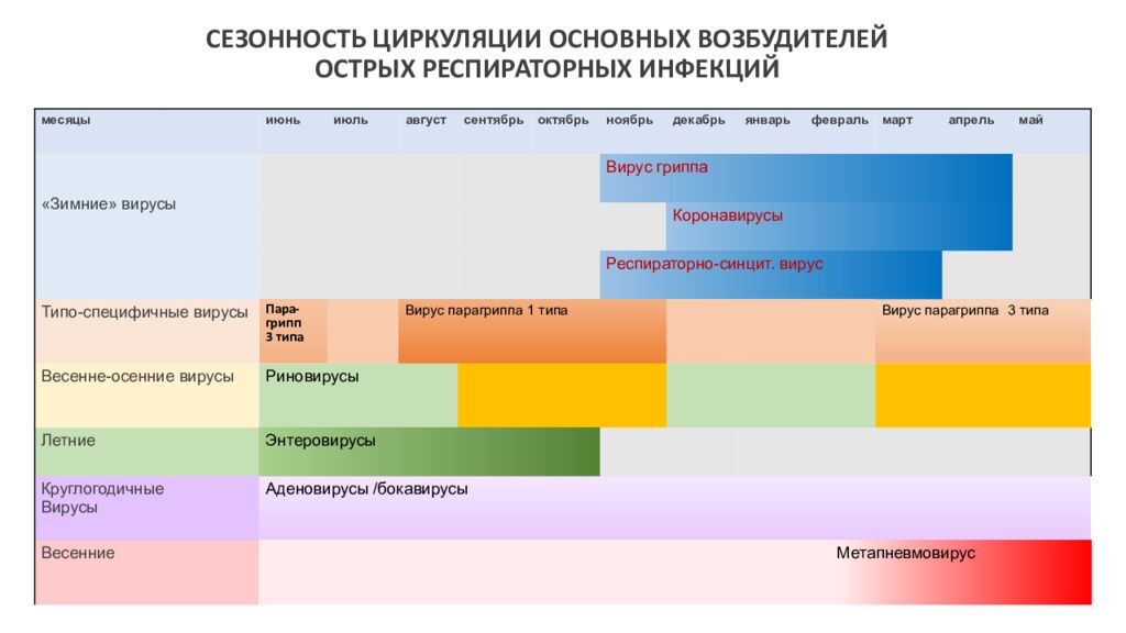 месяцы июнь июль август сентябрь октябрь ноябрь декабрь январь февраль март апрель май «Зимние » вирусы Вирус гриппа Коронавирусы Респираторно- синцит. вирус Типо -специфичные вирусы Пара-грипп 3 типа Вирус парагриппа 1 типа Вирус парагриппа 3 типа Весенне-осенние вирусы Риновирусы Летние Энтеровирусы Круглогодичные Вирусы Аденовирусы / бокавирусы Весенние Метапневмовирус