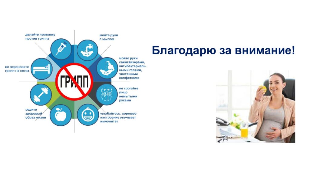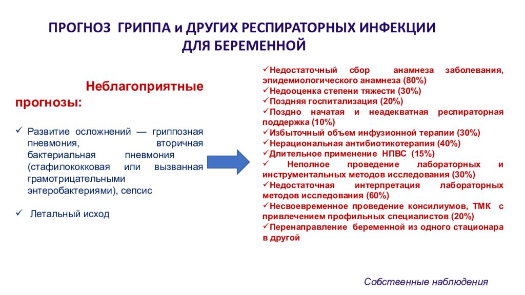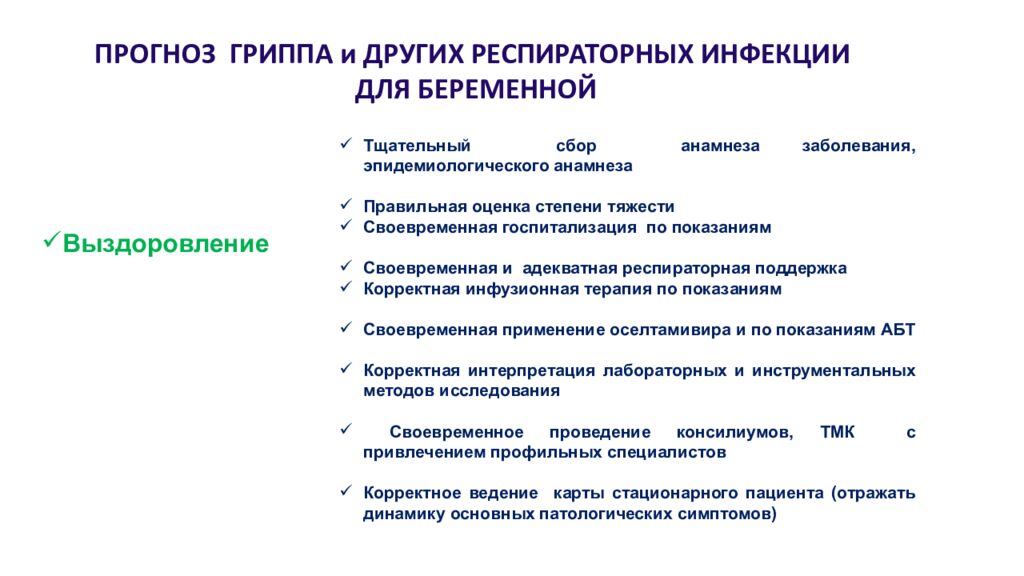 Тщательный сбор анамнеза заболевания, эпидемиологического анамнеза Правильная оценка степени тяжести Своевременная госпитализация по показаниям Своевременная и адекватная респираторная поддержка Корректная инфузионная терапия по показаниям Своевременная применение оселтамивира и по показаниям АБТ Корректная интерпретация лабораторных и инструментальных методов исследования Своевременное проведение консилиумов, ТМК с привлечением профильных специалистов Корректное ведение карты стационарного пациента (отражать динамику основных патологических симптомов) ПРОГНОЗ ГРИППА и ДРУГИХ РЕСПИРАТОРНЫХ ИНФЕКЦИИ ДЛЯ БЕРЕМЕННОЙ Выздоровление