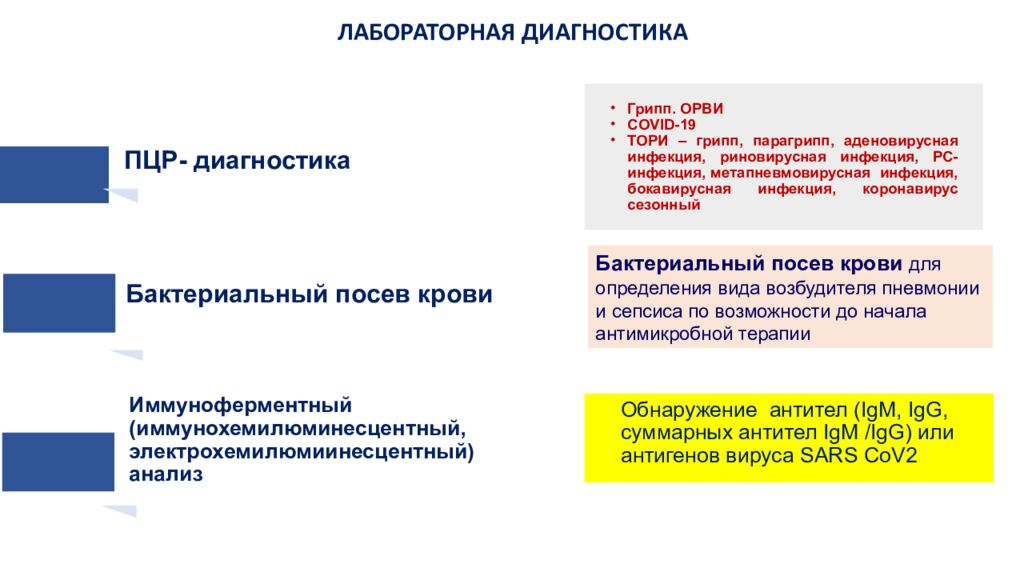 16 ЛАБОРАТОРНАЯ ДИАГНОСТИКА Бактериальный посев крови Грипп. ОРВИ COVID-19 ТОРИ – грипп, парагрипп, аденовирусная инфекция, риновирусная инфекция, РС-инфекция, метапневмовирусная инфекция, бокавирусная инфекция, коронавирус сезонный ПЦР- диагностика Иммуноферментный ( иммунохемилюминесцентный, электрохемилюмиинесцентный ) анализ Обнаружение антител ( IgM, IgG, суммарных антител IgM / IgG ) или антигенов вируса SARS CoV2 Бактериальный посев крови для определения вида возбудителя пневмонии и сепсиса по возможности до начала антимикробной терапии