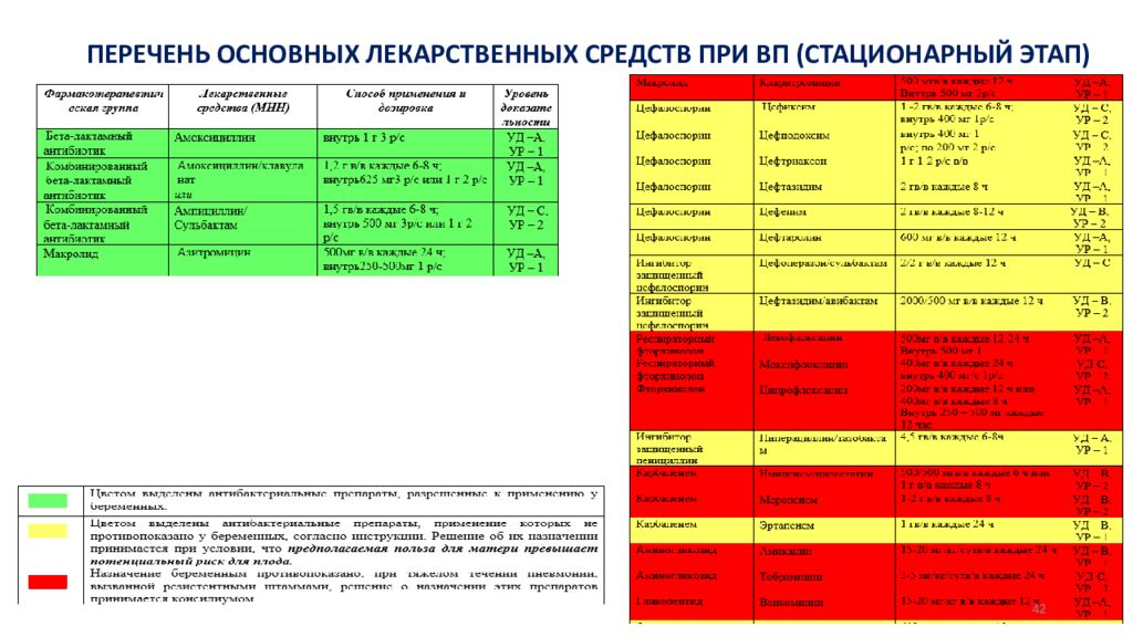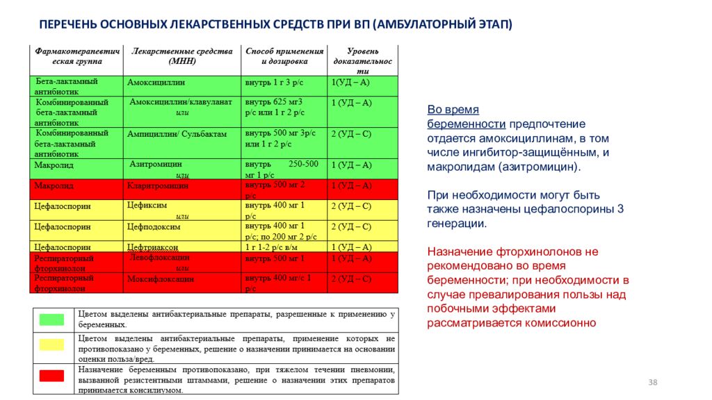 38 ПЕРЕЧЕНЬ ОСНОВНЫХ ЛЕКАРСТВЕННЫХ СРЕДСТВ ПРИ ВП (АМБУЛАТОРНЫЙ ЭТАП) Во время беременности предпочтение отдается амоксициллинам, в том числе ингибитор-защищённым, и макролидам ( азитромицин ). При необходимости могут быть также назначены цефалоспорины 3 генерации. Назначение фторхинолонов не рекомендовано во время беременности; при необходимости в случае превалирования пользы над побочными эффектами рассматривается комиссионно