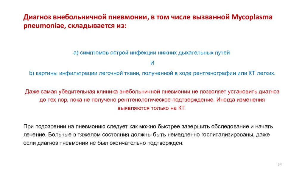 Слайд 34: Диагноз внебольничной пневмонии, в том числе вызванной Mycoplasma pneumoniae, складывается из: