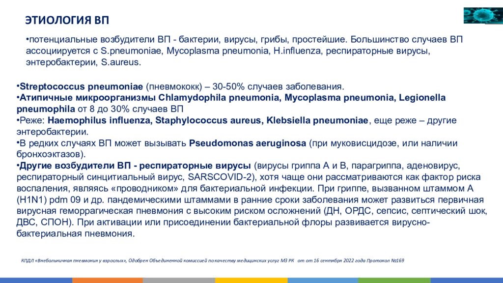 30 ЭТИОЛОГИЯ ВП потенциальные возбудители ВП - бактерии, вирусы, грибы, простейшие. Большинство случаев ВП ассоциируется с S.pneumoniae, Mycoplasma pneumonia, H.influenza, респираторные вирусы, энтеробактерии, S.aureus. Streptococcus pneumoniae (пневмококк) – 30-50% случаев заболевания. Атипичные микроорганизмы Chlamydophila pneumonia, Mycoplasma pneumonia, Legionella pneumophila от 8 до 30% случаев ВП Реже: Haemophilus influenza, Staphylococcus aureus, Klebsiella pneumoniae, еще реже – другие энтеробактерии. В редких случаях ВП может вызывать Pseudomonas aeruginosa (при муковисцидозе, или наличии бронхоэктазов ). Другие возбудители ВП - респираторные вирусы (вирусы гриппа А и B, парагриппа, аденовирус, респираторный синцитиальный вирус, SARSCOVID-2), хотя чаще они рассматриваются как фактор риска воспаления, являясь «проводником» для бактериальной инфекции. При гриппе, вызванном штаммом A (H1N1) pdm 09 и др. пандемическими штаммами в ранние сроки заболевания может развиться первичная вирусная геморрагическая пневмония с высоким риском осложнений (ДН, ОРДС, сепсис, септический шок, ДВС, СПОН). При активации или присоединении бактериальной флоры развивается вирусно-бактериальная пневмония. КПДЛ «Внебольничная пневмония у взрослых», Одобрен Объединенной комиссией по качеству медицинских услуг МЗ РК от от 16 сентября 2022 года Протокол №169