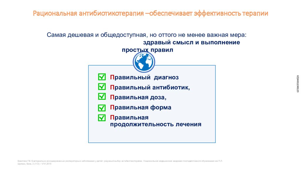 Бекетова Г.В. Бактериально -ассоциированные респираторные заболевания у детей: разумный выбор антибиотикотерапии. Национальная медицинская академия последипломного образования им П.Л. Шупика, Киев, 3 (113) – V/VI 2016 Рациональная антибиотикотерапия –обеспечивает эффективность терапии Самая дешевая и общедоступная, но оттого не менее важная мера: здравый смысл и выполнение простых правил П равильный диагноз П равильный антибиотик, П равильная доза, П равильная форма П равильная продолжительность лечения KZ2401190123