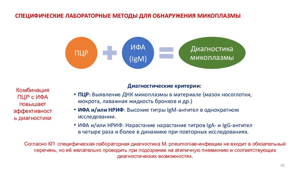 Диагностические критерии: ПЦР: Выявление ДНК микоплазмы в материале (мазок носоглотки, мокрота, лаважная жидкость бронхов и др.) ИФА и/или НРИФ : Высокие титры IgM -антител в однократном исследовании. ИФА и/или НРИФ: Нарастание нарастание титров IgA - и IgG -антител в четыре раза и более в динамике при повторных исследованиях. 36 Согласно КП с пецифическая лабораторная диагностика M. pneumoniae -инфекции не входит в обязательный перечень, но её желательно проводить при подозрении на атипичную пневмонию и соответствующих диагностических возможностях. Комбинация ПЦР с ИФА повышает эффективность диагностики