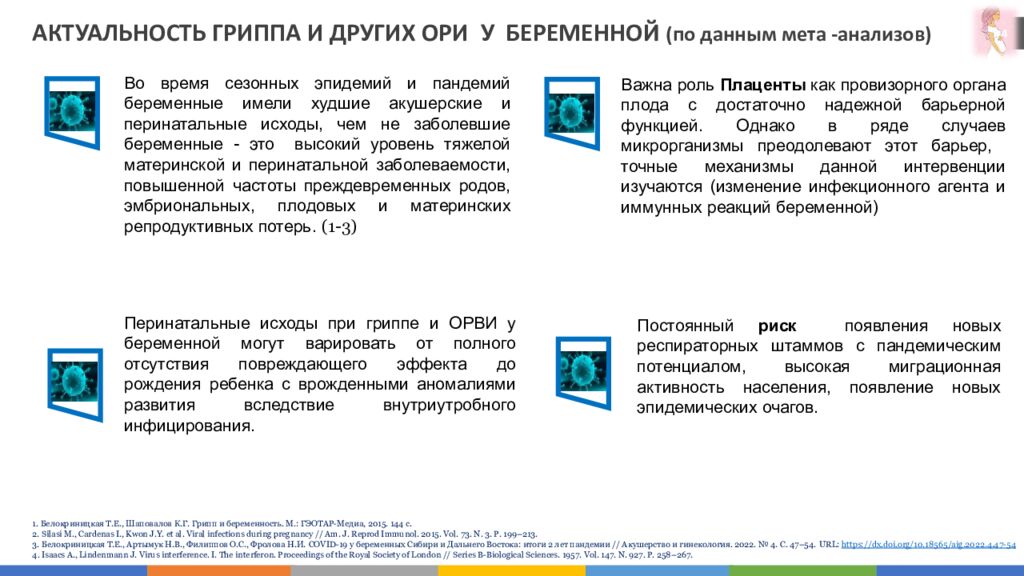 Во время сезонных эпидемий и пандемий б еременные имели худшие акушерские и перинатальные исходы, чем не заболевшие беременные - это высокий уровень тяжелой материнской и перинатальной заболеваемости, повышенной частоты преждевременных родов, эмбриональных, плодовых и материнских репродуктивных потерь. (1-3) Постоянный риск появления новых респираторных штаммов с пандемическим потенциалом, высокая миграционная активность населения, появление новых эпидемических очагов. Перинатальные исходы при гриппе и ОРВИ у беременной могут варировать от полного отсутствия повреждающего эффекта до рождения ребенка с врожденными аномалиями развития вследствие внутриутробного инфицирования. Важна роль Плаценты как провизорного органа плода с достаточно надежной барьерной функцией. Однако в ряде случаев микрорганизмы преодолевают этот барьер, точные механизмы данной интервенции изучаются (изменение инфекционного агента и иммунных реакций беременной) АКТУАЛЬНОСТЬ ГРИППА И ДРУГИХ ОРИ У БЕРЕМЕННОЙ (по данным мета -анализов) 1. Белокриницкая Т.Е., Шаповалов К.Г. Грипп и беременность. М.: ГЭОТАР-Медиа, 2015. 144 с. 2. Silasi M., Cardenas I., Kwon J.Y. et al. Viral infections during pregnancy // Am. J. Reprod Immunol. 2015. Vol. 73. N. 3. P. 199–213. 3. Белокриницкая Т.Е., Артымук Н.В., Филиппов О.С., Фролова Н.И. COVID-19 у беременных Сибири и Дальнего Востока: итоги 2 лет пандемии // Акушерство и гинекология. 2022. № 4. С. 47–54. URL: https:// dx.doi.org/10.18565/aig.2022.4.47-54 4. Isaacs A., Lindenmann J. Virus interference. I. The interferon. Proceedings of the Royal Society of London // Series B-Biological Sciences. 1957. Vol. 147. N. 927. P. 258–267. 4