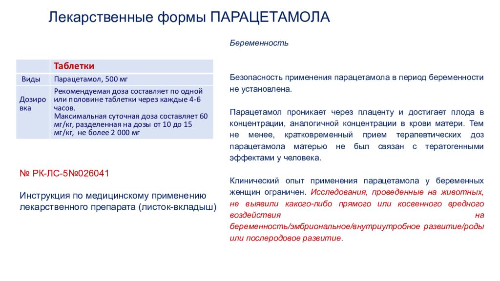 Таблетки Виды Парацетамол, 500 мг Дозировка Рекомендуемая доза составляет по одной или половине таблетки через каждые 4-6 часов. Максимальная суточная доза составляет 60 мг/кг, разделенная на дозы от 10 до 15 мг/кг, не более 2 000 мг Лекарственные формы ПАРАЦЕТАМОЛА Беременность Безопасность применения парацетамола в период беременности не установлена. Парацетамол проникает через плаценту и достигает плода в концентрации, аналогичной концентрации в крови матери. Тем не менее, кратковременный прием терапевтических доз парацетамола матерью не был связан с тератогенными эффектами у человека. Клинический опыт применения парацетамола у беременных женщин ограничен. Исследования, проведенные на животных, не выявили какого-либо прямого или косвенного вредного воздействия на беременность/эмбриональное/внутриутробное развитие/роды или послеродовое развитие. № РК-ЛС-5№ 026041 Инструкция по медицинскому применению лекарственного препарата (листок-вкладыш)