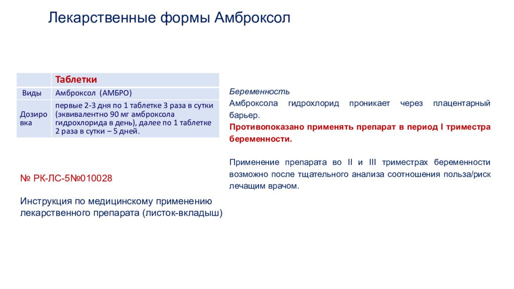 Таблетки Виды Амброксол (АМБРО) Дозировка первые 2-3 дня по 1 таблетке 3 раза в сутки (эквивалентно 90 мг амброксола гидрохлорида в день), далее по 1 таблетке 2 раза в сутки – 5 дней. Лекарственные формы Амброксол Беременность Амброксола гидрохлорид проникает через плацентарный барьер. Противопоказано применять препарат в период I триместра беременности. Применение препарата во II и III триместрах беременности возможно после тщательного анализа соотношения польза/риск лечащим врачом. № РК-ЛС-5№ 010028 Инструкция по медицинскому применению лекарственного препарата (листок-вкладыш)