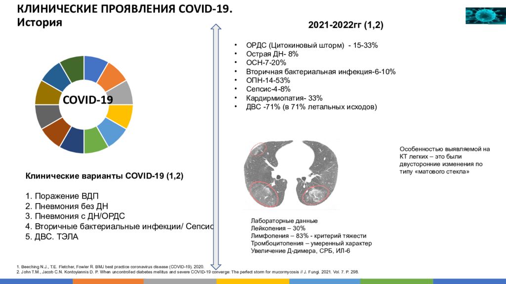 Клинические варианты COVID-19 (1,2) Поражение ВДП Пневмония без ДН Пневмония с ДН/ОРДС Вторичные бактериальные инфекции/ Сепсис ДВС. ТЭЛА КЛИНИЧЕСКИЕ ПРОЯВЛЕНИЯ COVID-19. История COVID-19 2021-2022гг (1,2) ОРДС ( Цитокиновый шторм ) - 15-33% Острая ДН- 8% ОСН-7-20% Вторичная бактериальная инфекция-6-10% ОПН-14-53% Сепсис-4-8% Кардирмиопатия - 33% ДВС -71% (в 71% летальных исходов) Особенностью выявляемой на КТ легких – это были двусторонние изменения по типу «матового стекла» Лабораторные данные Лейкопения – 30% Лимфопения – 83% - критерий тяжести Тромбоцитопения – умеренный характер Увеличение Д- димера, СРБ, ИЛ-6 1. Beeching N.J., T.E. Fletcher, Fowler R. BMJ best practice coronavirus disease (COVID-19). 2020. 2. John T.M., Jacob C.N. Kontoyiannis D. P. When uncontrolled diabetes mellitus and severe COVID-19 converge: The perfect storm for mucormycosis // J. Fungi. 2021. Vol. 7. P. 298.