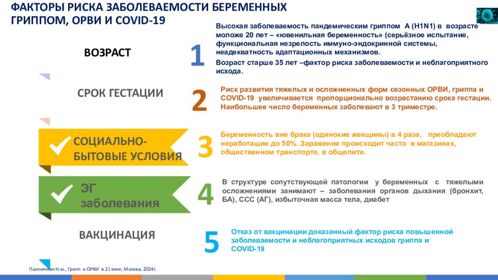 ВОЗРАСТ СРОК ГЕСТАЦИИ СОЦИАЛЬНО- БЫТОВЫЕ УСЛОВИЯ ЭГ заболевания Высокая заболеваемость пандемическим гриппом А (Н1 N1 ) в возрасте моложе 20 лет – «ювенильная беременность» (серьёзное испытание, функциональная незрелость иммуно -эндокринной системы, неадекватность адаптационных механизмов. Возраст старше 35 лет –фактор риска заболеваемости и неблагоприятного исхода. 1 Риск развития тяжелых и осложненных форм сезонных ОРВИ, гриппа и COVID-19 увеличивается пропорционально возрастанию срока гестации. Наибольшее число беременных заболевают в 3 триместре. 2 Беременность вне брака (одинокие женщины) в 4 раза, преобладают неработащие до 50%. Заражение происходит часто в магазинах, общественном транспорте, в общепите. 3 В структуре сопутствующей патологии у беременных с тяжелыми осложнениями занимают – заболевания органов дыхания (бронхит, БА), ССС (АГ), избыточная масса тела, диабет 4 ФАКТОРЫ РИСКА ЗАБОЛЕВАЕМОСТИ БЕРЕМЕННЫХ ГРИППОМ, ОРВИ И COVID-19 ВАКЦИНАЦИЯ Отказ от вакцинации доказанный фактор риска повышенной заболеваемости и неблагоприятных исходов гриппа и COVID-19 5 Пшеничная Н.ю., Грипп и ОРВИ в 21 веке, Москва, 2024г.