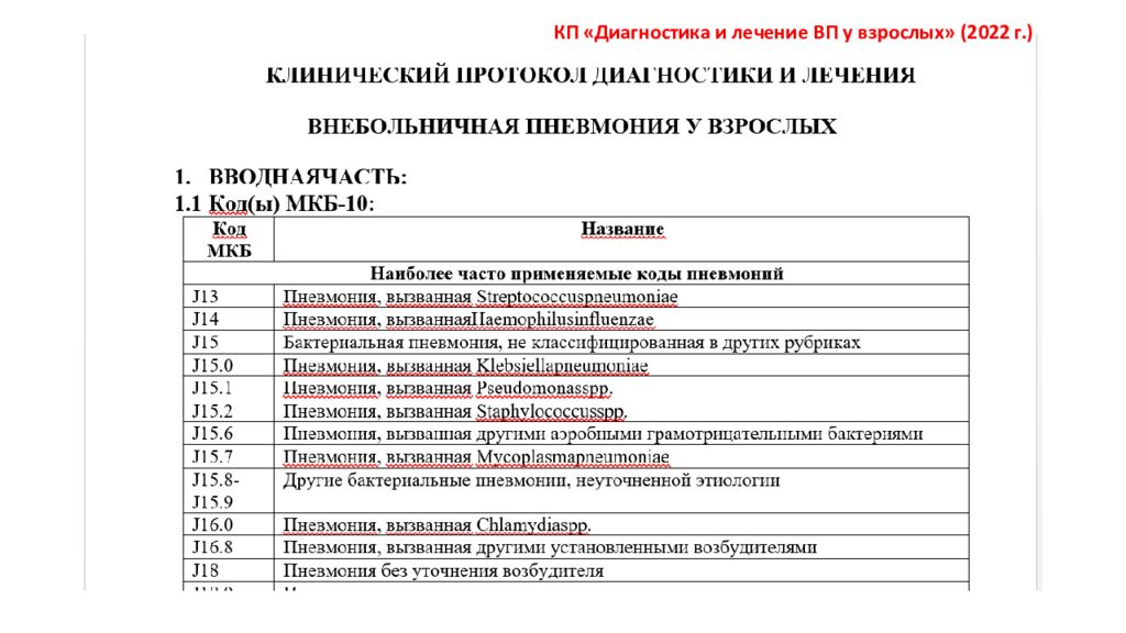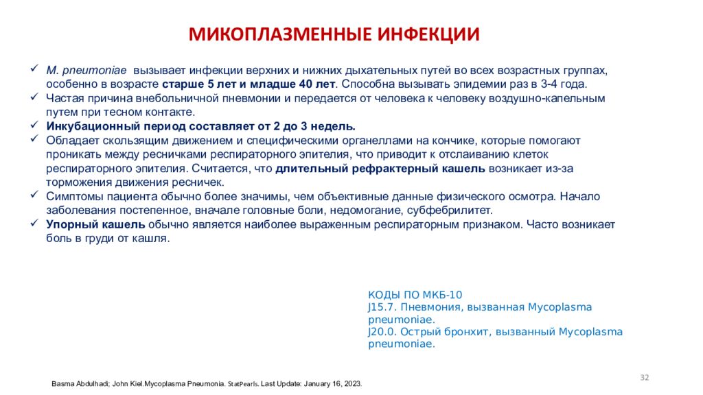 M. pneumoniae вызывает инфекции верхних и нижних дыхательных путей во всех возрастных группах, особенно в возрасте старше 5 лет и младше 40 лет. Способна вызывать эпидемии раз в 3 -4 года. Ч астая причина внебольничной пневмонии и передается от человека к человеку воздушно-капельным путем при тесном контакте. Инкубационный период составляет от 2 до 3 недель. О бладает скользящим движением и специфическими органеллами на кончике, которые помогают проникать между ресничками респираторного эпителия, что приводит к отслаиванию клеток респираторного эпителия. Считается, что длительный рефрактерный кашель возникает из-за торможения движения ресничек. Симптомы пациента обычно более значимы, чем объективные данные физического осмотра. Начало заболевания постепенное, вначале головные боли, недомогание, субфебрилитет. Упорный кашель обычно является наиболее выраженным респираторным признаком. Часто возникает боль в груди от кашля. Basma Abdulhadi ; John Kiel.Mycoplasma Pneumonia. StatPearls. Last Update: January 16, 2023. 32 КОДЫ ПО МКБ-10 J15.7. Пневмония, вызванная Mycoplasma pneumoniae. J20.0. Острый бронхит, вызванный Mycoplasma pneumoniae.