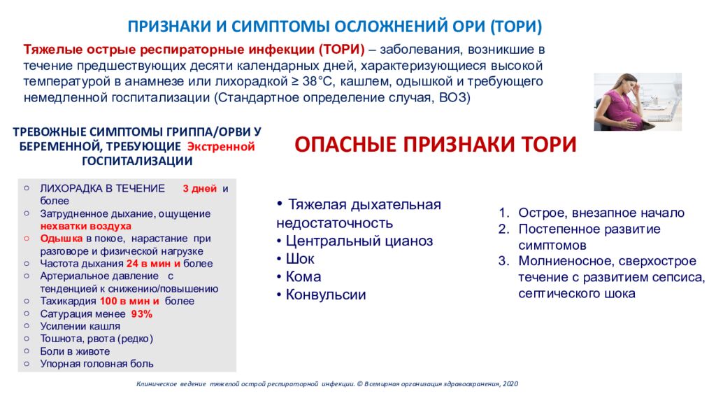 ПРИЗНАКИ И СИМПТОМЫ ОСЛОЖНЕНИЙ ОРИ (ТОРИ) Клиническое ведение тяжелой острой респираторной инфекции. © Всемирная организация здравоохранения, 2020 Тяжелые острые респираторные инфекции (ТОРИ) – заболевания, возникшие в течение предшествующих десяти календарных дней, характеризующиеся высокой температурой в анамнезе или лихорадкой ≥ 38°С, кашлем, одышкой и требующего немедленной госпитализации (Стандартное определение случая, ВОЗ) • Тяжелая дыхательная недостаточность • Центральный цианоз • Шок • Кома • Конвульсии ОПАСНЫЕ ПРИЗНАКИ ТОРИ Острое, внезапное начало Постепенное развитие симптомов Молниеносное, сверхострое течение с развитием сепсиса, септического шока Лихорадка в течение 3 дней и более Затрудненное дыхание, ощущение нехватки воздуха Одышка в покое, нарастание при разговоре и физической нагрузке Частота дыхания 24 в мин и более Артериальное давление с тенденцией к снижению/повышению Тахикардия 100 в мин и более Сатурация менее 93% Усилении кашля Тошнота, рвота ( редко) Боли в животе Упорная головная боль ТРЕВОЖНЫЕ СИМПТОМЫ ГРИППА/ОРВИ У БЕРЕМЕННОЙ, ТРЕБУЮЩИЕ Экстренной ГОСПИТАЛИЗАЦИИ