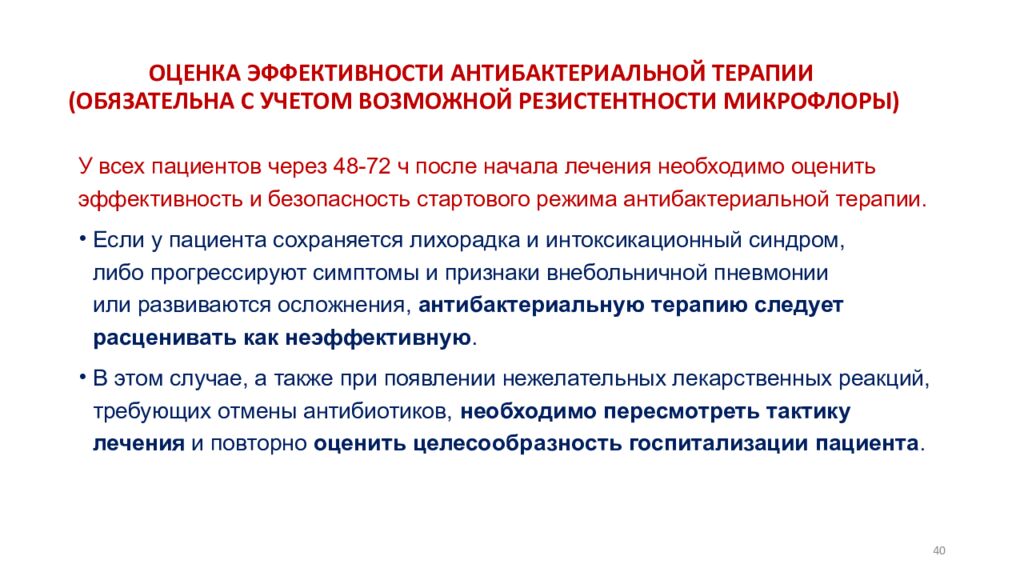 Слайд 40: ОЦЕНКА ЭФФЕКТИВНОСТИ АНТИБАКТЕРИАЛЬНОЙ ТЕРАПИИ (ОБЯЗАТЕЛЬНА С УЧЕТОМ ВОЗМОЖНОЙ РЕЗИСТЕНТНОСТИ МИКРОФЛОРЫ)