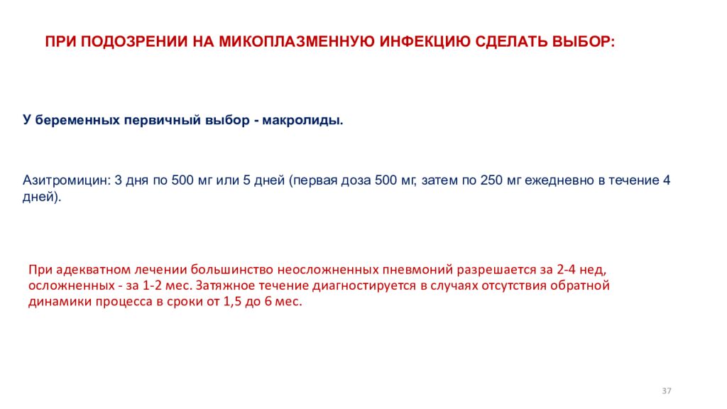 При адекватном лечении большинство неосложненных пневмоний разрешается за 2-4 нед, осложненных - за 1-2 мес. Затяжное течение диагностируется в случаях отсутствия обратной динамики процесса в сроки от 1,5 до 6 мес. 37 У беременных первичный выбор - макролиды. Азитромицин : 3 дня по 500 мг или 5 дней (первая доза 500 мг, затем по 250 мг ежедневно в течение 4 дней).