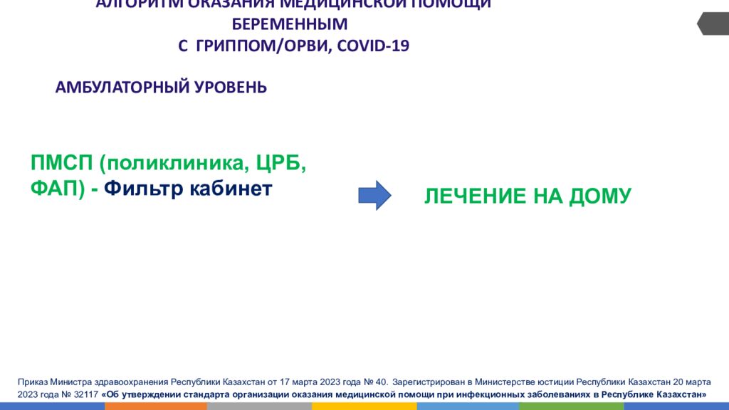 ПМСП (поликлиника, ЦРБ, ФАП) - Фильтр кабинет Приказ Министра здравоохранения Республики Казахстан от 17 марта 2023 года № 40. Зарегистрирован в Министерстве юстиции Республики Казахстан 20 марта 2023 года № 32117 «Об утверждении стандарта организации оказания медицинской помощи при инфекционных заболеваниях в Республике Казахстан» АМБУЛАТОРНЫЙ УРОВЕНЬ ЛЕЧЕНИЕ НА ДОМУ