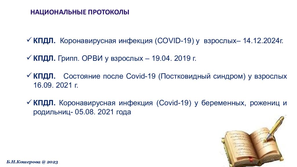 КПДЛ. Коронавирусная инфекция (COVID-19) у взрослых– 14.12.2024г. КПДЛ. Грипп. ОРВИ у взрослых – 19.04. 2019 г. КПДЛ. Состояние после Covid-19 ( П остковидный синдром) у взрослых 16.09. 2021 г. КПДЛ. К оронавирусная инфекция ( Covid-19 ) у беременных, рожениц и родильниц- 05.08. 2021 года Б.Н.Кошерова @ 2023 48
