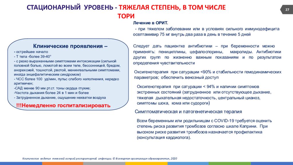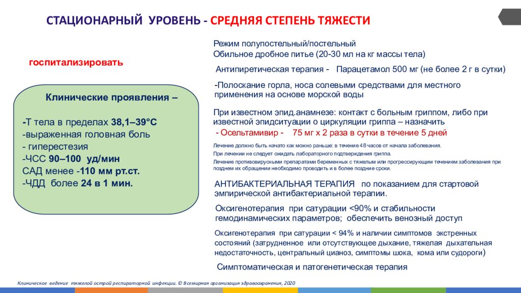 Режим полупостельный/постельный Обильное дробное питье (20-30 мл на кг массы тела) - Полоскание горла, носа солевыми средствами для местного применения на основе морской воды При известном эпид.анамнезе : контакт с больным гриппом, либо при известной эпидситуации о циркуляции гриппа – назначить - Осельтамивир - 75 мг х 2 раза в сутки в течение 5 дней Лечение должно быть начато как можно раньше: в течение 48 часов от начала заболевания. При лечении не следует ожидать лабораторного подтверждения гриппа. Лечение противовирусными препаратами беременных с тяжелым или прогрессирующим течением заболевания при позднем их обращении необходимо проводить и в более поздние сроки. Оксигенотерапия при сатурации <90% и стабильности гемодинамических параметров; обеспечить венозный доступ Оксигенотерапия при сатурации < 94% и наличии симптомов экстренных состояний (затрудненное или отсутствующее дыхание, тяжелая дыхательная недостаточность, центральный цианоз, симптомы шока, кома или судороги ) АНТИБАКТЕРИАЛЬНАЯ ТЕРАПИЯ по показанием для стартовой эмпирической антибактериальной терапии. Клинические проявления – - Т тела в пределах 38,1–39°С -выраженная головная боль - гиперестезия -ЧСС 90–100 уд/мин САД менее - 110 мм рт.ст. -ЧДД более 24 в 1 мин. Антипиретическая терапия - Парацетамол 500 мг (не более 2 г в сутки) Симптоматическая и патогенетическая терапия госпитализировать Клиническое ведение тяжелой острой респираторной инфекции. © Всемирная организация здравоохранения, 2020