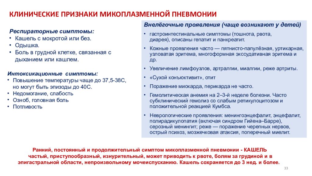 Слайд 33: КЛИНИЧЕСКИЕ ПРИЗНАКИ МИКОПЛАЗМЕННОЙ ПНЕВМОНИИ
