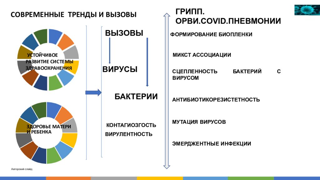 ВЫЗОВЫ СОВРЕМЕННЫЕ ТРЕНДЫ И ВЫЗОВЫ УСТОЙЧИВОЕ РАЗВИТИЕ СИСТЕМЫ ЗДРАВООХРАНЕНИЯ Авторский слайд ВИРУСЫ БАКТЕРИИ МУТАЦИЯ ВИРУСОВ ВИРУЛЕНТНОСТЬ ФОРМИРОВАНИЕ БИОПЛЕНКИ МИКСТ АССОЦИАЦИИ СЦЕПЛЕННОСТЬ БАКТЕРИЙ С ВИРУСОМ АНТИБИОТИКОРЕЗИСТЕТНОСТЬ КОНТАГИОЗГОСТЬ ЭМЕРДЖЕНТНЫЕ ИНФЕКЦИИ ГРИПП. ОРВИ. COVID.ПНЕВМОНИИ