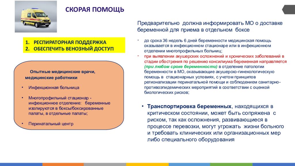 Предварительно должна информировать МО о доставке беременной для приема в отдельном боксе Опытные медицинские врачи, медицинские работники до срока 36 недель 6 дней беременности медицинская помощь оказывается в инфекционном стационаре или в инфекционном отделении многопрофильных больниц; при выявлении акушерских осложнений и хронических заболеваний в стадии обострения по решению консилиума беременная направляется (при любом сроке беременности) в отделение патологии беременности в МО, оказывающие акушерско-гинекологическую помощь в стационарных условиях, с учетом принципов регионализации перинатальной помощи и соблюдением санитарно-противоэпидемических мероприятий в соответствии с оценкой биологических рисков ; Инфекционная больница Многопрофильный стационар - инфекционное отделение : беременные изолируются в боксы/ боксированные палаты, в отдельные палаты; Перинатальный центр РЕСПИРАТОРНАЯ ПОДДЕРЖКА ОБЕСПЕЧИТЬ ВЕНОЗНЫЙ ДОСТУП Транспортировка беременных, находящихся в критическом состоянии, может быть сопряжена с риском, так как осложнения, развивающиеся в процессе перевозки, могут угрожать жизни больного и требовать клинических или организационных мер либо специального оборудования