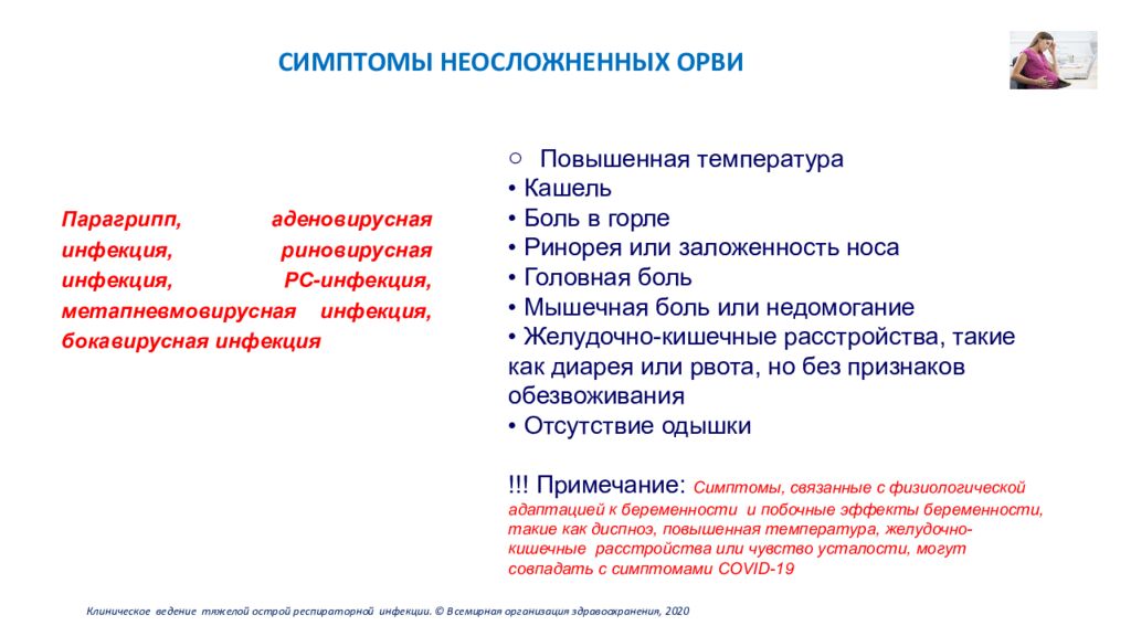 СИМПТОМЫ НЕОСЛОЖНЕННЫХ ОРВИ Повышенная температура • Кашель • Боль в горле • Ринорея или заложенность носа • Головная боль • Мышечная боль или недомогание • Желудочно-кишечные расстройства, такие как диарея или рвота, но без признаков обезвоживания • Отсутствие одышки !!! Примечание: Симптомы, связанные с физиологической адаптацией к беременности и побочные эффекты беременности, такие как диспноэ, повышенная температура, желудочно-кишечные расстройства или чувство усталости, могут совпадать с симптомами COVID-19 Клиническое ведение тяжелой острой респираторной инфекции. © Всемирная организация здравоохранения, 2020 Парагрипп, аденовирусная инфекция, риновирусная инфекция, РС-инфекция, метапневмовирусная инфекция, бокавирусная инфекция