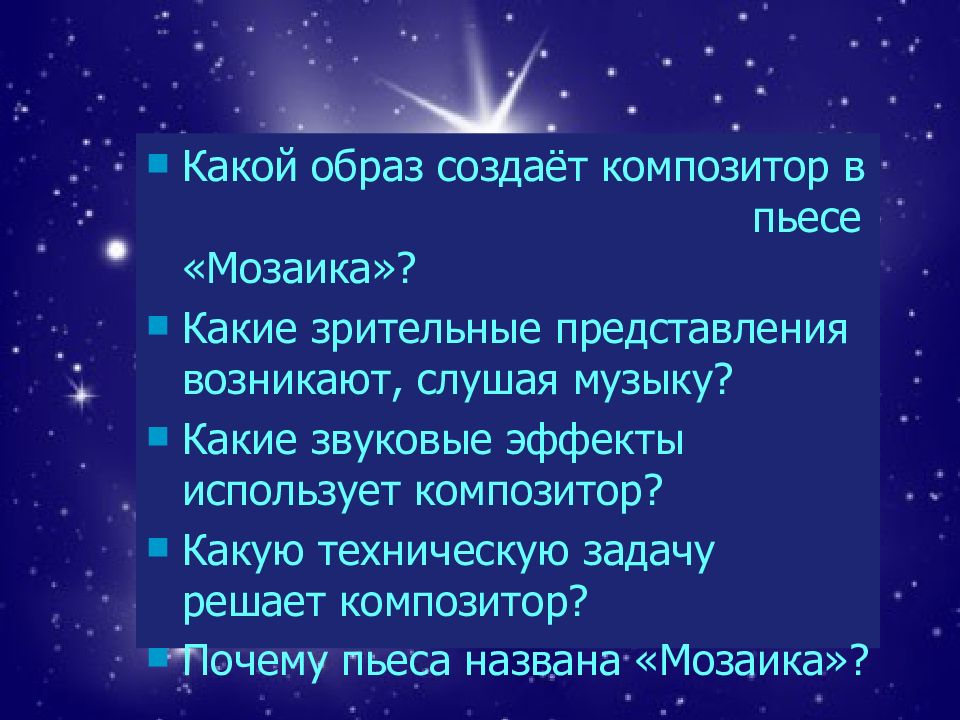 Какой образ создаёт композитор в пьесе «Мозаика»? Какие зрительные представления возникают, слушая музыку? Какие звуковые эффекты использует композитор? Какую техническую задачу решает композитор? Почему пьеса названа «Мозаика»?